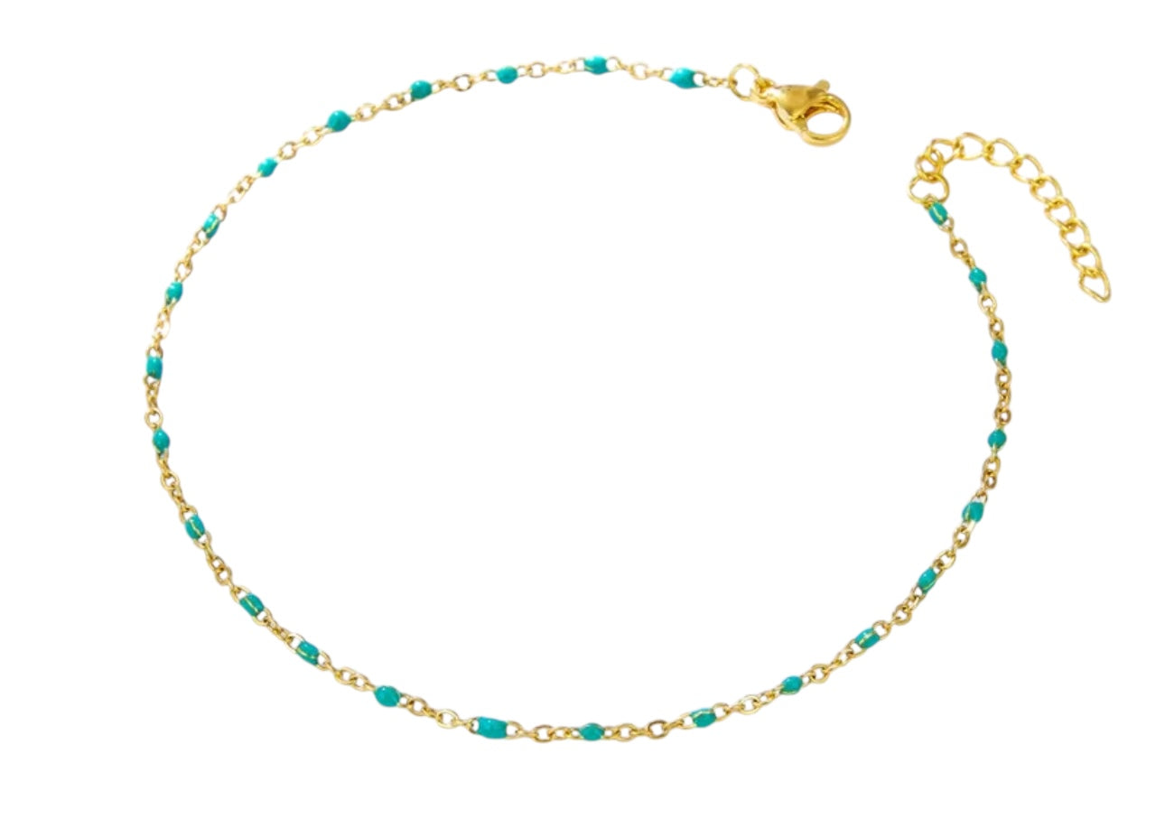 Add a touch of elegance to your every step with this delicate anklet. Crafted with a radiant gold finish and accented by subtle teal details, it’s designed to be both lightweight and comfortable for all-day wear. Whether you’re dressing up for a night out or keeping it casual at the beach, this anklet brings the perfect balance of style and sophistication.